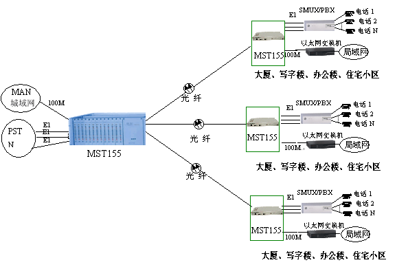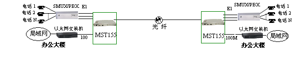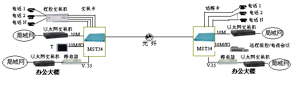 方案描述: 通常的4E1,8E1,12E1,16E1光端機只提供1個RS2332口,1個公務口(可選),1個管理口。它們的應用方案如上圖。而MST34,MST155型光端機可根據客戶要求適當配置V.35卡,10M以太網卡,話路卡,這樣在一個設備上即可解決以上問題。